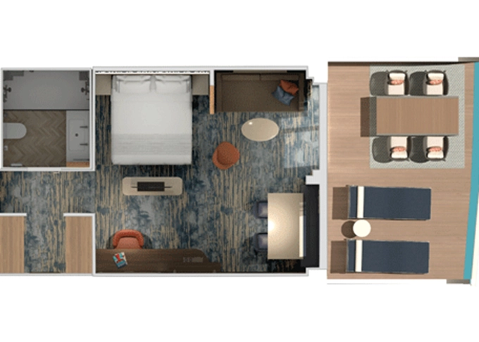 | HU - Suite Havana Cabana Corner 33 m² + vonkajšie rohové patio 15 m². 8. paluba vpredu. Max 3 osoby. Tropický štýl, vstup do exkluzívnej zóny Havana. Výhody Suite. | 4 200 € 2 100 € za osobu | ||
