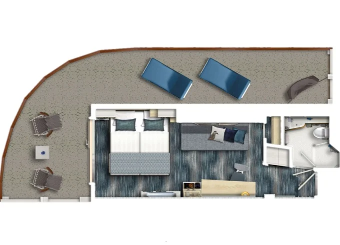 SUTO - Themen Suite 54 m² + balkón 15 m² so stolom, ležadlom a hojdacou sieťou. Spálňa, obývacia časť, šatník. 10. paluba. Max 4 osoby. Výhody Suite. 15 598 € 7 799 € za osobu
